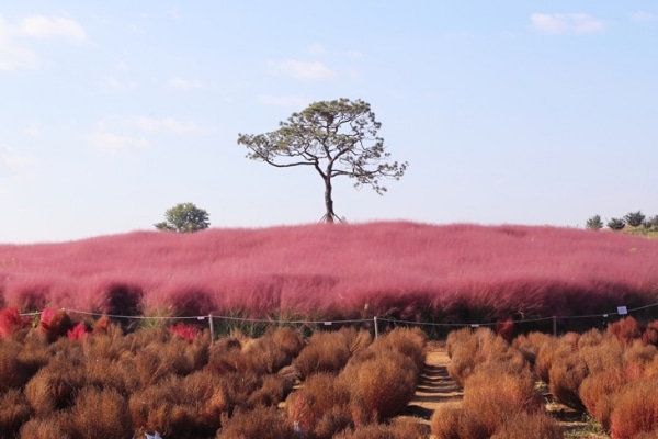 나무 한 그루 + 뮬리 배경 SNS 후기에서 “핑크뮬리 사이에 있는 나무 한그루가 정말 아름답다”는 언급이 있어요. [인스타그램]