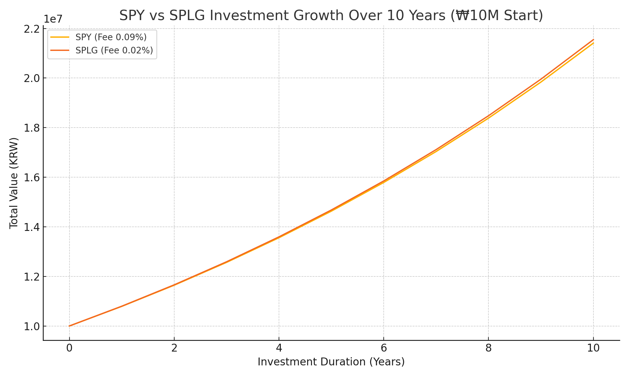 아래 그래프는 SPY(0.09%)와 SPLG(0.02%)에 1,000만원을 투자하고, 10년간 연 8% 수익을 올렸다고 가정했을 때의 차이를 보여줍니다.